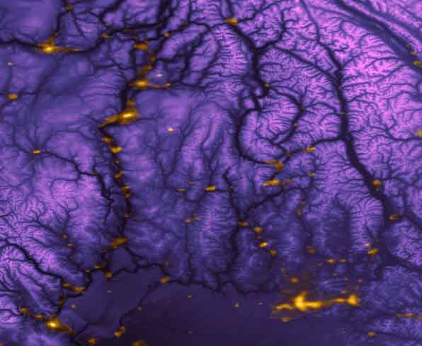 1) Maps of the upward light flux. They are the simplest kind of map and show the total light flux emitted upward by the sources on the Earth surface and introducted in the atmosphere. Map of the upward light flux from North-East Italy in 1996-1997. They are obtained simply from the radiance calibrated data of the DMSP satellites. The data need to be corrected for the extinction on the light in the path from the source to the satellite. When possible they are deconvolved in order to obtain a better spatial resolution. The total emitted flux must be recovered from the flux emitted toward the satellite, assuming a typical average upward emission function for all the areas or obtaining it based on measurements of each area from different elevation angles made from many individual orbits. 2) Maps of the effects of the light pollution on the night sky. The general public frequently confuse these maps with the night-time satellite images. Satellite night-time images of the Earth show the light flux emitted upward, these maps shows the effects of this light on the night sky due to its propagation in the atmosphere and its scattering by molecules and particles. Differences are easily recognizable e.g. in lakes, seas or desertic lands near populated areas, where there are no sources. . Upward light flux (left) and its effect: the artificial night sky brightness (right). They are black in satellite images but there is nonzero sky brightness (colour) in maps of artificial sky brightness due to light pollution propagation. Moreover the propagation of light pollution gives them a smooth appairance even if the resolution is nearly the same. Upward light flux from Veneto cities measured by DMSP satellite.